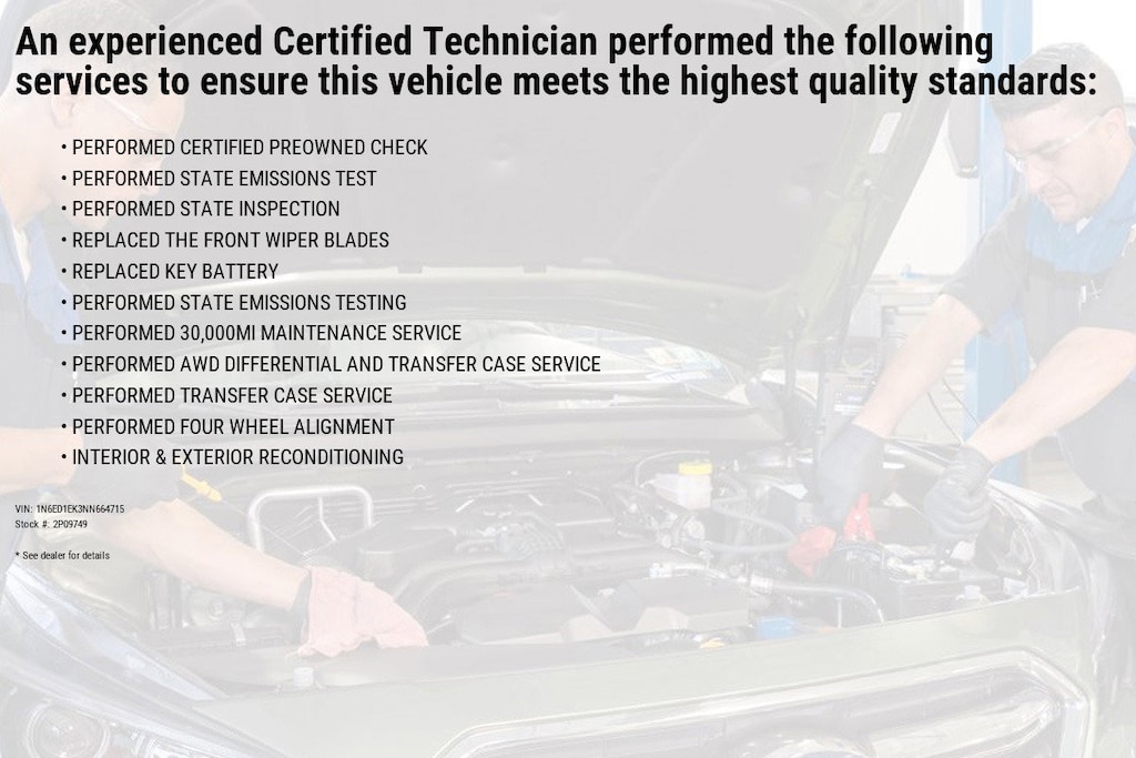 * 7 Year/100,000 Mile Limited Warranty, 24/7 Hour Roadside Assistance, Carfax Vehicle History Report, Plus 1 Year Pre-Paid Maintenance Included. Gas Powered Nissan Models Only. (for Nissan Certified program), 84-Point Inspection Process, 6-Months/6,000 Mile Limited Warranty, 24/7 Hour Roadside Assistance, Carfax Vehicle History Report, Plus 1 Complimentary Service Visit Included. (for Certified Select program), 139-Point Inspection Process, 7-Year/100,000 Mile Limited Warranty, 1 Year Prepaid Maintenance Included in the First Year of Ownership or 15,000 Miles, Whichever Comes First. 100% Electric Nissan Models Only. (for EV Certified program)