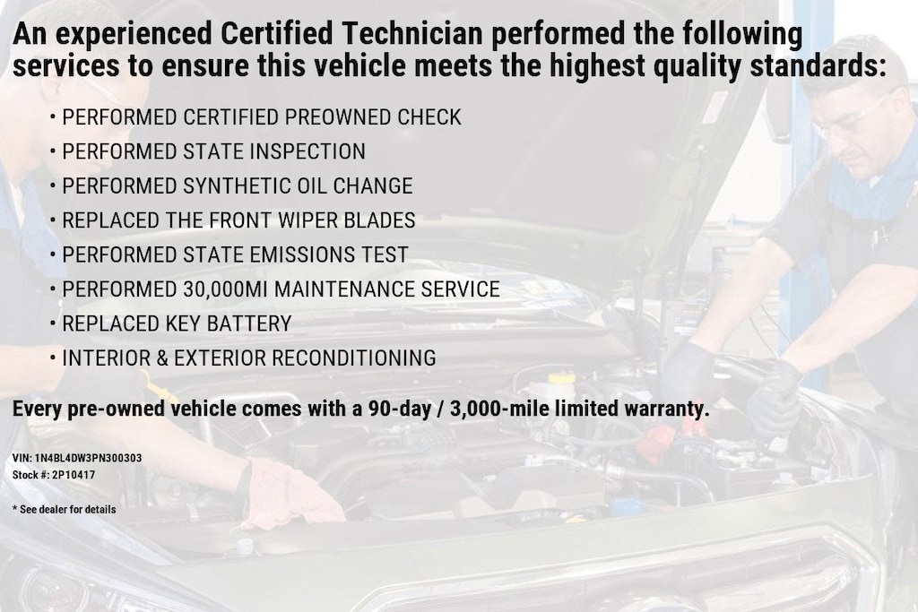 CVT with Xtronic 2.5L 4-Cylinder DOHC 16V 17" Machined Alloy Wheels, 4-Wheel Disc Brakes, 6 Speakers, ABS brakes, Active Ride Control (ARC), Air Conditioning, Alloy wheels, AM/FM radio: SiriusXM, Auto High-beam Headlights, Blind Spot Warning, Body-Colored Outside Mirrors, Body-Colored Splash Guards, Brake assist, Bumpers: body-color, Chrome Bumper Protector, Cloth Seat Trim, Delay-off headlights, Driver door bin, Driver vanity mirror, Dual front impact airbags, Dual front side impact airbags, Electronic Parking Brake w/Auto-Hold, Electronic Stability Control, Exhaust Finishers, Floor Mats/Trunk Mat/Hideaway Net, Four wheel independent suspension, Front anti-roll bar, Front Bucket Seats, Front Center Armrest, Front reading lights, Fully automatic headlights, Heated Front Seats, Illuminated entry, Intelligent Cruise Control w/Full Spd Range & Hold, Intelligent Lane Intervention (I-LI), Intelligent Trace Control (I-TC), Knee airbag, Leather Shift Knob, Leather Steering Wheel, Low tire pressure warning, NissanConnect, NissanConnect featuring Apple CarPlay and Android Auto, Occupant sensing airbag, Outside temperature display, Overhead airbag, Overhead console, Panic alarm, Passenger door bin, Passenger vanity mirror, Power door mirrors, Power driver seat, Power steering, Power windows, Premium Interior Finishers, ProPILOT Assist, Radio data system, Radio: AM/FM Audio System, Rear anti-roll bar, Rear Parking Sensors, Rear reading lights, Rear seat center armrest, Rear side impact airbag, Rear window defroster, Remote keyless entry, Security system, Single Panel Moonroof, Speed control, Speed-sensing steering, Speed-Sensitive Wipers, Split folding rear seat, Steering Assist, Steering wheel mounted audio controls, SV Premium Package, Tachometer, Telescoping steering wheel, Tilt steering wheel, Traction control, Traffic Sign Recognition, Trip computer, Trunk Organizer Tray, Variably intermittent wipers.