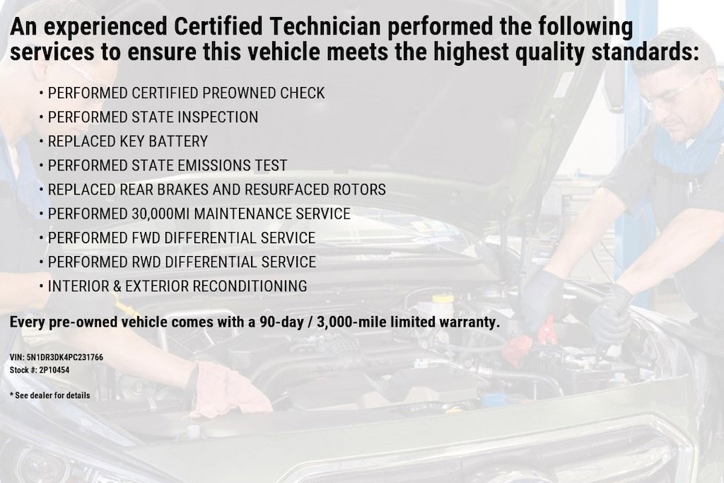 * 7 Year/100,000 Mile Limited Warranty, 24/7 Hour Roadside Assistance, Carfax Vehicle History Report, Plus 1 Year Pre-Paid Maintenance Included. Gas Powered Nissan Models Only. (for Nissan Certified program), 12-Months/12,000 Mile Limited Warranty, 24/7 Hour Roadside Assistance, Carfax Vehicle History Report, Plus 1 Complimentary Service Visit During the First Year of Ownership or First 15,000 Miles, Whichever Comes First. (for Certified Select program), 7-Year/100,000 Mile Limited Warranty, 1 Year Prepaid Maintenance Included in the First Year of Ownership or 15,000 Miles, Whichever Comes First. 100% Electric Nissan Models Only. (for EV Certified program)