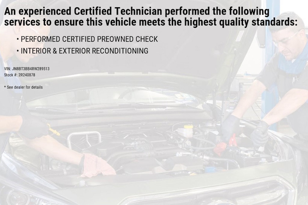 * 7 Year/100,000 Mile Limited Warranty, 24/7 Hour Roadside Assistance, Carfax Vehicle History Report, Plus 1 Year Pre-Paid Maintenance Included. Gas Powered Nissan Models Only. (for Nissan Certified program), 84-Point Inspection Process, 6-Months/6,000 Mile Limited Warranty, 24/7 Hour Roadside Assistance, Carfax Vehicle History Report, Plus 1 Complimentary Service Visit Included. (for Certified Select program), 139-Point Inspection Process, 7-Year/100,000 Mile Limited Warranty, 1 Year Prepaid Maintenance Included in the First Year of Ownership or 15,000 Miles, Whichever Comes First. 100% Electric Nissan Models Only. (for EV Certified program)