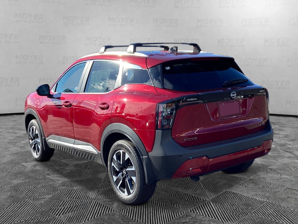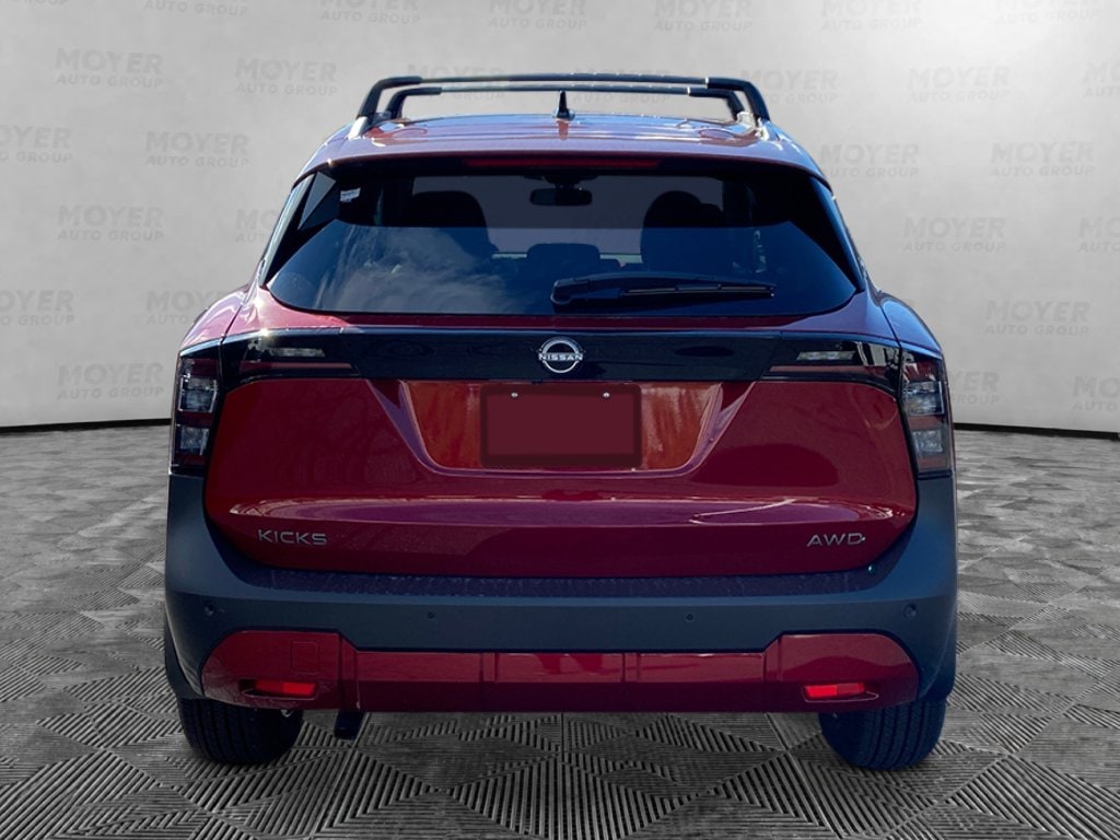 17" Alloy Wheels, 4 Speakers, 4-Wheel Disc Brakes, ABS brakes, Air Conditioning, Alloy wheels, AM/FM radio, Auto High-beam Headlights, Automatic temperature control, Blind Spot Warning, Brake assist, Bumpers: body-color, Carpeted Floor Mats, Cloth Seat Trim, Cold Weather Package, Crossbars, Driver door bin, Driver vanity mirror, Dual front impact airbags, Dual front side impact airbags, Electronic Stability Control, Emergency communication system, Exterior Parking Camera Rear, Four wheel independent suspension, Front anti-roll bar, Front Bucket Seats, Front Center Armrest, Front reading lights, Fully automatic headlights, Heated Front Seats, Heated Mirrors, Illuminated Driver and Passenger Sun Visors, Illuminated entry, Knee airbag, Low tire pressure warning, NissanConnect featuring Apple CarPlay and Android Auto, Occupant sensing airbag, Outside temperature display, Overhead airbag, Panic alarm, Panoramic Moonroof, Passenger door bin, Passenger vanity mirror, Power door mirrors, Power steering, Power windows, Premium Paint, Radio data system, Radio: AM/FM/SiriusXM Audio System, Rear anti-roll bar, Rear Floor Heater Ducts, Rear reading lights, Rear side impact airbag, Rear window defroster, Rear window wiper, Remote keyless entry, Security system, Speed control, Speed-sensing steering, Splash Guards, Split folding rear seat, Spoiler, Sport steering wheel, Steering wheel mounted audio controls, Sunglass Holder, SV Premium Package, Tachometer, Telescoping steering wheel, Tilt steering wheel, Traction control, Trip computer, Variably intermittent wipers. Scarlet Ember Tintcoat 2026 Nissan Kicks SV AWD CVT with Xtronic 2.0L DOHC