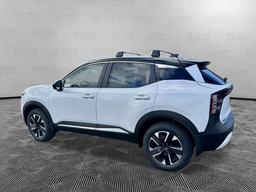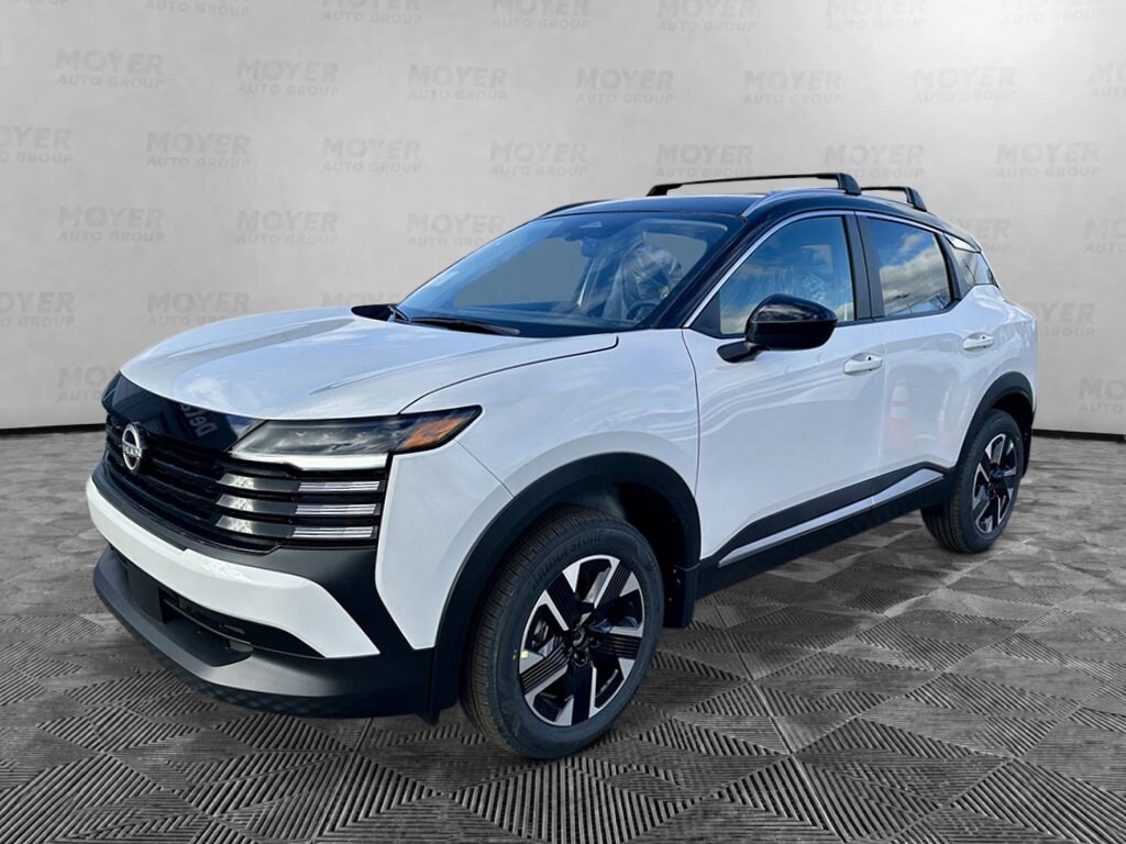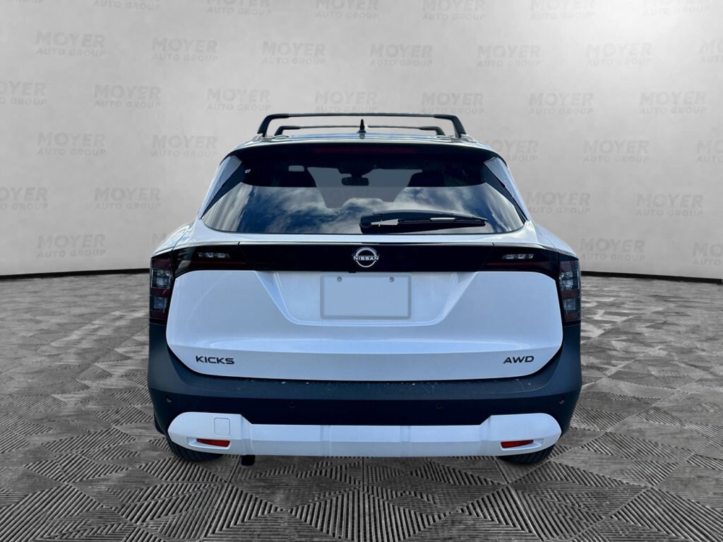17" Alloy Wheels, 2-Tone Premium Paint, 4 Speakers, 4-Wheel Disc Brakes, ABS brakes, Air Conditioning, Alloy wheels, AM/FM radio, Auto High-beam Headlights, Automatic temperature control, Blind Spot Warning, Brake assist, Bumpers: body-color, Carpeted Floor Mats, Cloth Seat Trim, Cold Weather Package, Crossbars, Driver door bin, Driver vanity mirror, Dual front impact airbags, Dual front side impact airbags, Electronic Stability Control, Emergency communication system, Exterior Parking Camera Rear, Four wheel independent suspension, Front anti-roll bar, Front Bucket Seats, Front Center Armrest, Front reading lights, Fully automatic headlights, Heated Front Seats, Heated Mirrors, Illuminated entry, Knee airbag, Low tire pressure warning, NissanConnect featuring Apple CarPlay and Android Auto, Occupant sensing airbag, Outside temperature display, Overhead airbag, Panic alarm, Passenger door bin, Passenger vanity mirror, Power door mirrors, Power steering, Power windows, Radio data system, Radio: AM/FM/SiriusXM Audio System, Rear anti-roll bar, Rear Floor Heater Ducts, Rear reading lights, Rear side impact airbag, Rear window defroster, Rear window wiper, Remote keyless entry, Security system, Speed control, Speed-sensing steering, Splash Guards, Split folding rear seat, Spoiler, Sport steering wheel, Steering wheel mounted audio controls, Tachometer, Telescoping steering wheel, Tilt steering wheel, Traction control, Trip computer, Variably intermittent wipers. Aspen White/Super Black 2026 Nissan Kicks SV AWD CVT with Xtronic 2.0L DOHC
